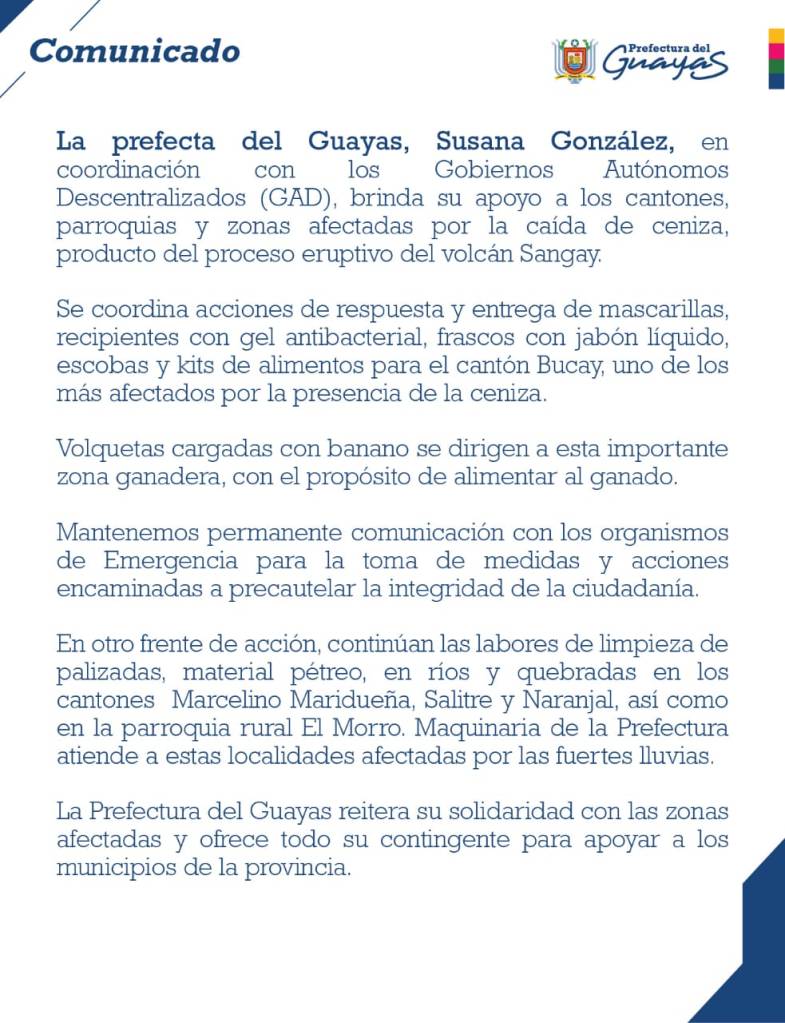 La prefecta del Guayas en coordinación con los GAD cantonales y parroquiales ejecutan un plan de apoyo y ayuda solidaria a los lugares afectados por la caída de ceniza debido al proceso eruptivo del volcán Sangay, con la entrega de mascarillas, plátano para las reces y kits de alimentos en el cantón Bucay que ha sido el más afectado.