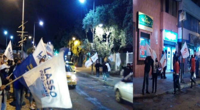Sin embargo, en el sur de Quito en horas de la noche los simpatizantes del candidato presidencial de la alianza CREO – PSC, Guillermo Lasso y el candidato presidencial de la alianza UNES de Andrés Arauz, midieron fuerzas, una mayor presencia de lado de Lasso que de Arauz con pitos, megáfonos avivaron por su preferencia mientras esperaban el arribo del líder de CREO, quién fue recibido con banderas, carteles, aplausos y una estela de serpentinas, una fiesta democrática.