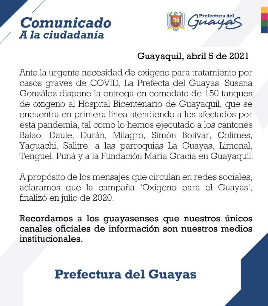 La prefecta del Guayas, Susana González informó que frente a la emergencia y difícil situación que enfrenta la provincia y la escasees de oxigeno a puesto a disposición del hospital Bicentenario de Guayaquil en comodato 150 tanques de oxigeno.