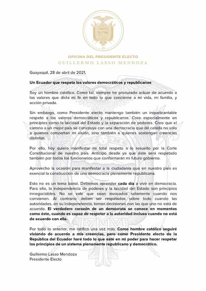 El Presidente electo, Guillermo Lasso a través de un comunicado dio a conocer su criterio entorno a la decisión de la Corte Constitucional sobre el tema del aborto en casos de violación, “soy un hombre catalítico como tal he procurado actuar de acuerdo a los valores que dicta mi fe”, dijo.