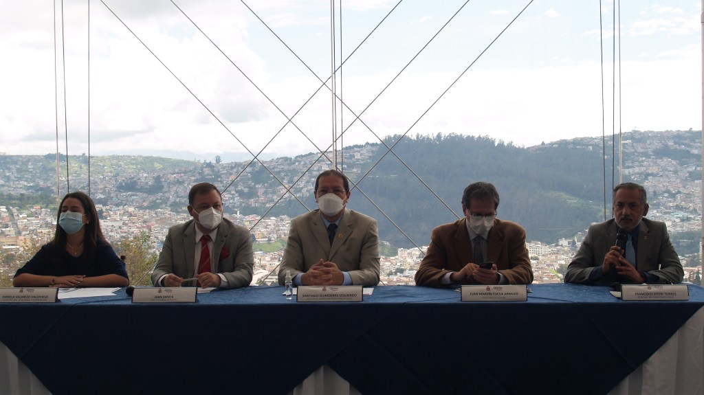 En el museo del agua el alcalde de Quito, Santiago Guarderas junto al director del COE Nacional, Juan Zapata; el secretario de Salud Francisco Viteri, secretario de Cultura, Juan Martín Cueva; la gerente general de Quito Turismo, Cristina Rivadeneira y la secretaria de Seguridad, Diana Valarezo, presentaron la agenda cultural de Fiestas de Quito 2021.