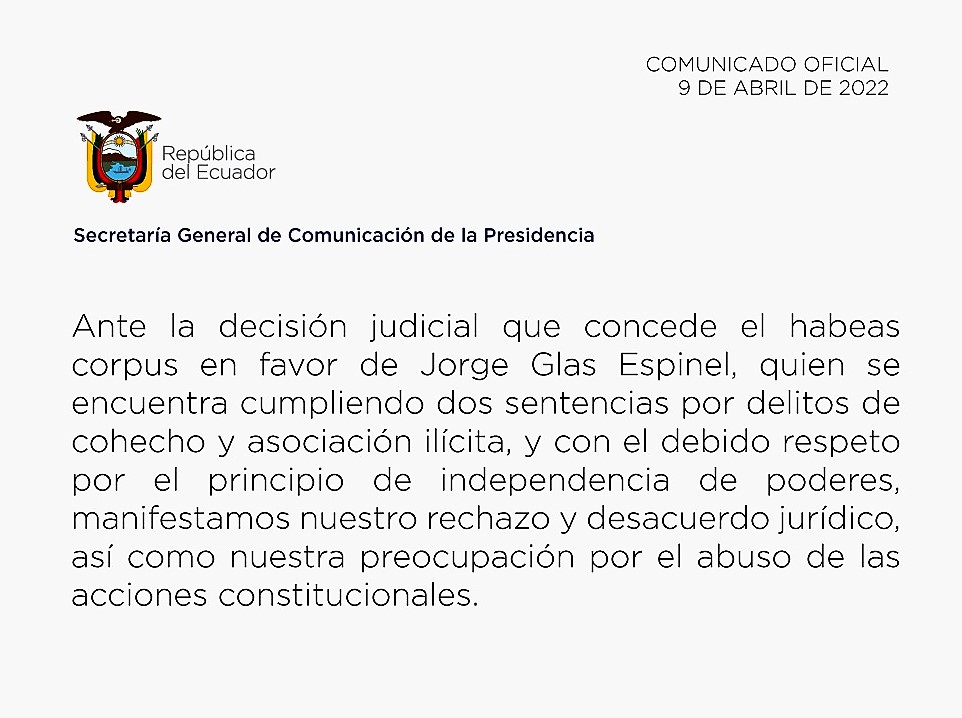Pero que significa el habeas corpus, “dentro del marco jurídico ecuatoriano, tenemos que la acción de habeas corpus es el mecanismo jurídico por el cual una persona que se considere en ilegal, arbitraria e ilegítima manera detenida, pueda ejercer la acción respectiva, con la finalidad de recobrar su libertad”, que el caso de Jorge Glas tendría una sentencia y habría cumplido el 60% de la condena.