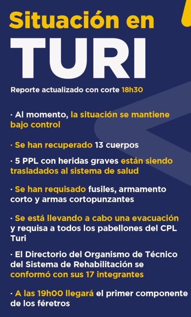Además, el SNAI junto a la Secretaría de Derechos Humanos brinda asistencia a los familiares de las víctimas, se han entregado kits de alimentación e hidratación para las personas privadas de libertad. Y todas las garantías necesarias a la empresa que provee la alimentación dentro del centro de rehabilitación para que se retome el servicio.