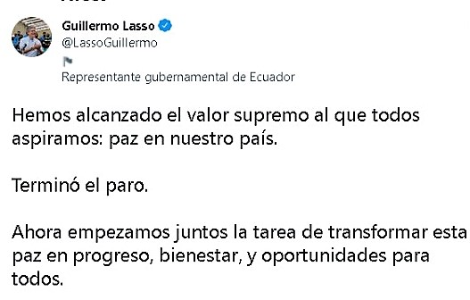 Mientras tanto, el presidente de la República, Guillermo Lasso, se pronunció a través de su cuenta de twitter “Hemos alcanzado el valor supremo al que todos aspiramos: paz en nuestro país. Terminó el paro. Ahora empezamos juntos la tarea de transformar esta paz en progreso, bienestar, y oportunidades para todos”.