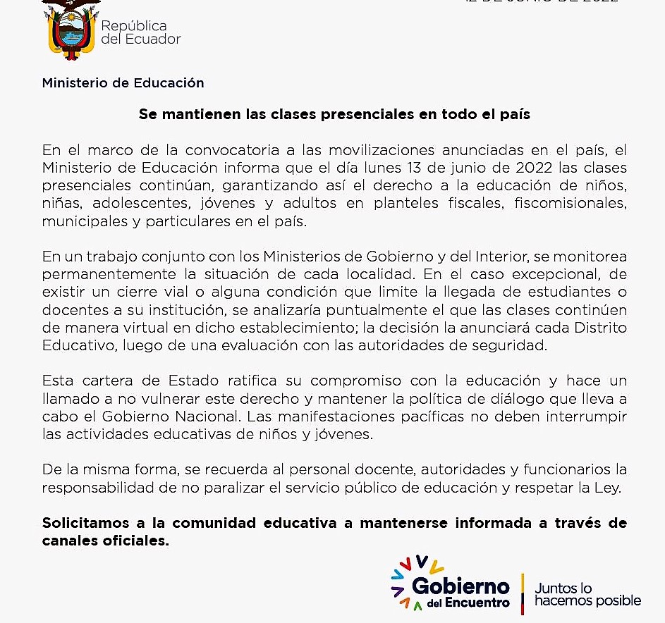 En el marco de la convocatoria a las movilizaciones anunciadas en el país, el Ministerio de Educación informa que el día lunes 13 de junio de 2022 las clases presenciales continúan, garantizando así el derecho a la educación de niños, niñas, adolescentes, jóvenes y adultos en planteles fiscales, fiscomisionales, municipales y particulares en el país.