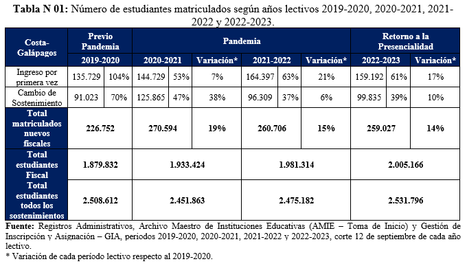 Como se puede observar en la Tabla N 01, en el régimen Costa-Galápagos, presentó un incremento del 14% (+32.275) de estudiantes que por primera vez se matricularon en instituciones educativas fiscales, entre los años lectivos 2022-2023 (259.027) y 2019-2020 (226.752). De igual manera, para el sostenimiento fiscal se tiene un 7% (+125.334) más con respecto al período previo pandemia, entre los años lectivos 2022-2023 (2’005.166) y 2019-2020 (1’879.832).