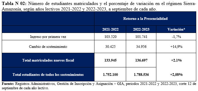 Por otro lado, en la tabla n 02, se puede observar la matrícula de estudiantes en el régimen sierra-amazonía en los meses de septiembre de los años lectivos 2021-2022 y 2022-2023.