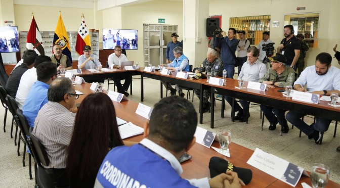 Luego, el Mandatario lideró una reunión de trabajo con los ministros de Estado y autoridades locales, en la Universidad Laica Eloy Alfaro. Desde este punto, anunció que se desarrollarán trabajos interinstitucionales para emprender obras emergentes y definitivas para Chone.