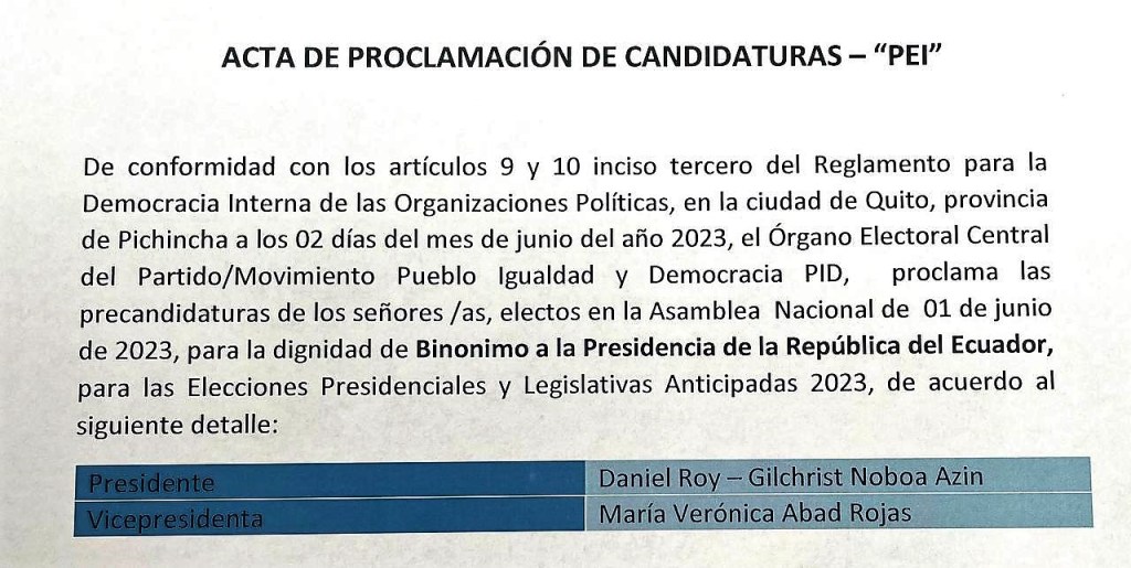 El Consejo Nacional Electoral receptó este 2 de junio 2023, la primera precandidatura del binomio presidencial del Movimiento Pueblo, Igualdad Democracia (PID), integrado por Daniel Noboa y Verónica Abad.