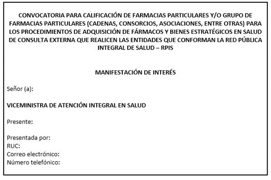 El Ministerio de Salud Pública convoca a las farmacias particulares y/o grupo de farmacias particulares (cadenas, consorcios, asociaciones, entre otras), a que manifiesten su interés de calificarse para participar en el Procedimiento de Adquisición de Fármacos y Bienes Estratégicos en Salud de Consulta Externa que Realicen las Entidades que Conforman la Red Pública Integral de Salud –RPIS, de acuerdo al artículo 85 del reglamento de la Ley Orgánica del Sistema Nacional de Contratación Pública, reformado mediante Decreto Ejecutivo 378 del 22 de marzo de 2022, publicado en el Tercer Suplemento Nº 27 del Registro Oficial de 23 de marzo de 2022.