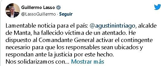 Mientras tanto, el presidente de la República, Guillermo Lasso en su cuenta de twitter, escribió «Lamentable noticia para el país. Agustín Intriago, alcalde de Manta, ha fallecido víctima de un atentado».