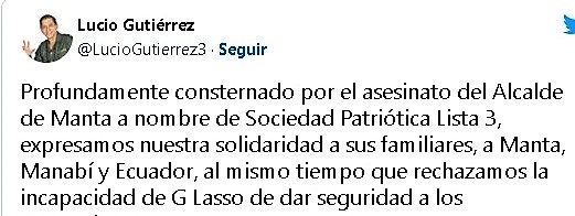 Mientras tanto, el expresidente de la República, Lucio Gutiérrez se mostró consternado por el acto delictivo dónde perdió la vida el alcalde de Manta, Agustín Intriago, expresó su solidaridad a los familiares y rechazo la incapacidad del Presidente Guillermo Lasso por no dar seguridad a los ecuatorianos.