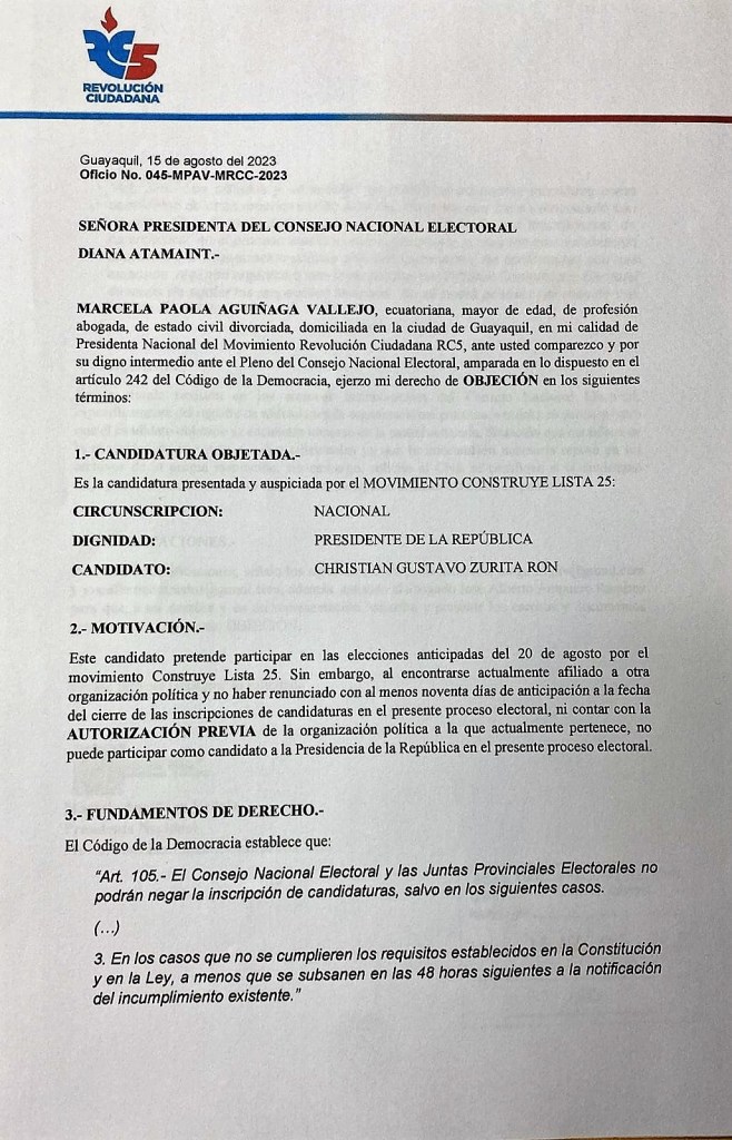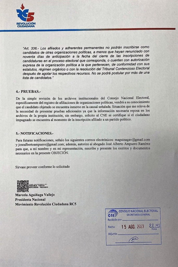 Además, el CNE negó la objeción presentada por la Revolución Ciudadana contra de la postulación, por cuanto el candidato no se encuentra afiliado o adherido a ninguna organización política.