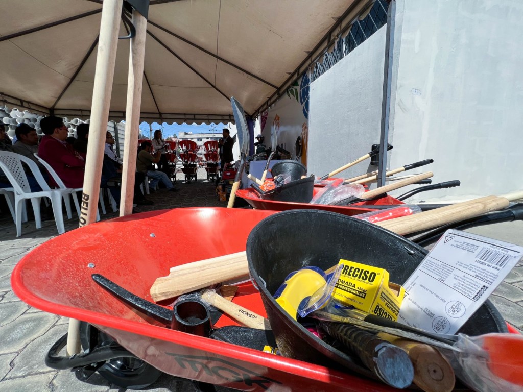 Así mismo, entre las herramientas entregadas constan Alicates, Arcos de sierra, Azadones, Baldes, Barras, Carretillas, Escaleras, Flexómetros y Linternas.