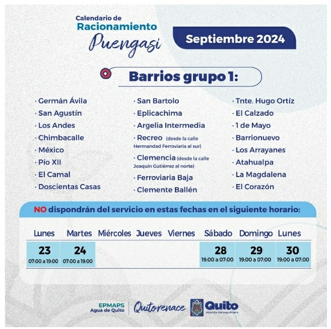 Por la ausencia de lluvias y las altas temperaturas, Agua de Quito informó que se implementará un cronograma de racionamiento para las zonas del centro y sur abastecidas por la planta de tratamiento de Agua Potable Puengasí, que rige desde las 19h00 del martes 1 de octubre 2024. https://www.aguaquito.gob.ec/epmaps-implementa-cronograma-temporal-de-racionamiento-para-sectores-atendidos-por-la-planta-puengasi-3/.
