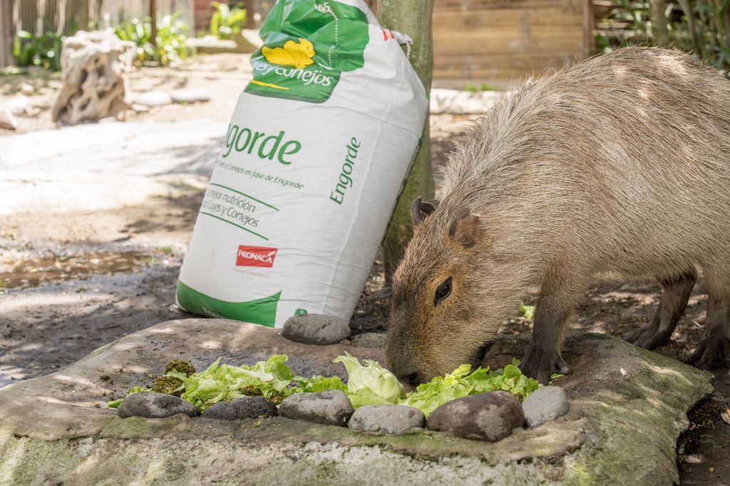 También, existen otros significativos, como el del capibara adulto que habita en el zoológico, un animal que consume el alimento balanceado de PRONACA. Igualmente, un olingo que llegó rescatado en noviembre del 2023, presumiblemente víctima del mascotismo, recibe una dieta complementada con alimento balanceado húmedo, otro producto que PRONACA provee al QuitoZoo, mediante esta alianza.