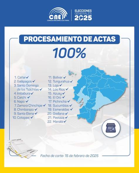 Hasta el momento, 22 provincias del país ya concluyeron el procesamiento de actas de escrutinio para las dignidades de binomio presidencial, asambleístas nacionales, provinciales y parlamentarios andinos: Cañar, Galápagos, Santo Domingo de los Tsáchilas, Imbabura, Carchi, Napo, Zamora Chinchipe, Chimborazo, Santa Elena, Cotopaxi, Bolívar, Tungurahua, Loja, Los Ríos, Azuay, El Oro, Pichincha, Sucumbíos, Esmeraldas, Orellana y Pastaza.