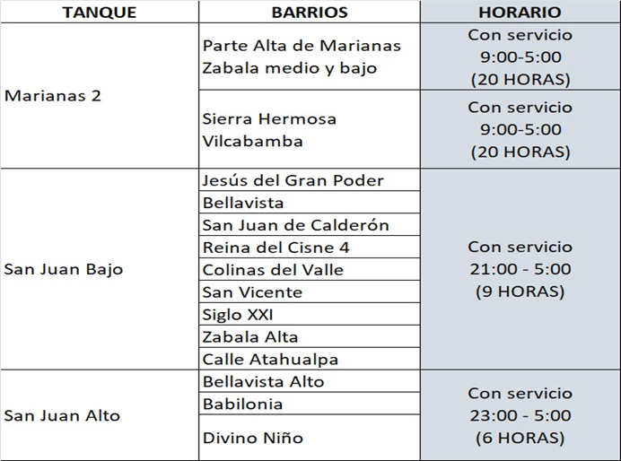 Con el fin de optimizar el agua disponible, la Empresa Pública Metropolitana de Agua Potable y Saneamiento (EPMAPS-Agua de Quito) ha dispuesto un cronograma de distribución que rige desde este 13 de diciembre, el objetivo es estabilizar el sistema de distribución en los próximos ocho días.